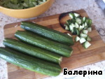 Огурцы мелко нарезать, если Вам нравится, можно нарезать соломкой мелкой, тоже эффектно смотрится!