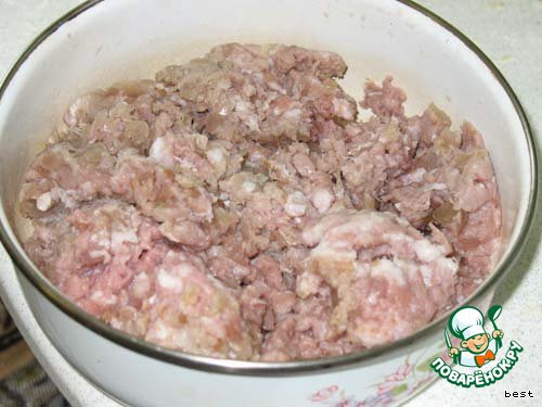 Приготовить начинку. Мясо с луком прокрутить через мясорубку.