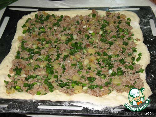 Распределить начинку. Раскатать вторую часть, выложить на начинку и защипать края. -