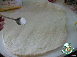 Раскатать тесто в прямоугольник и по всей поверхности посыпать 0,5 ч.л. соды.