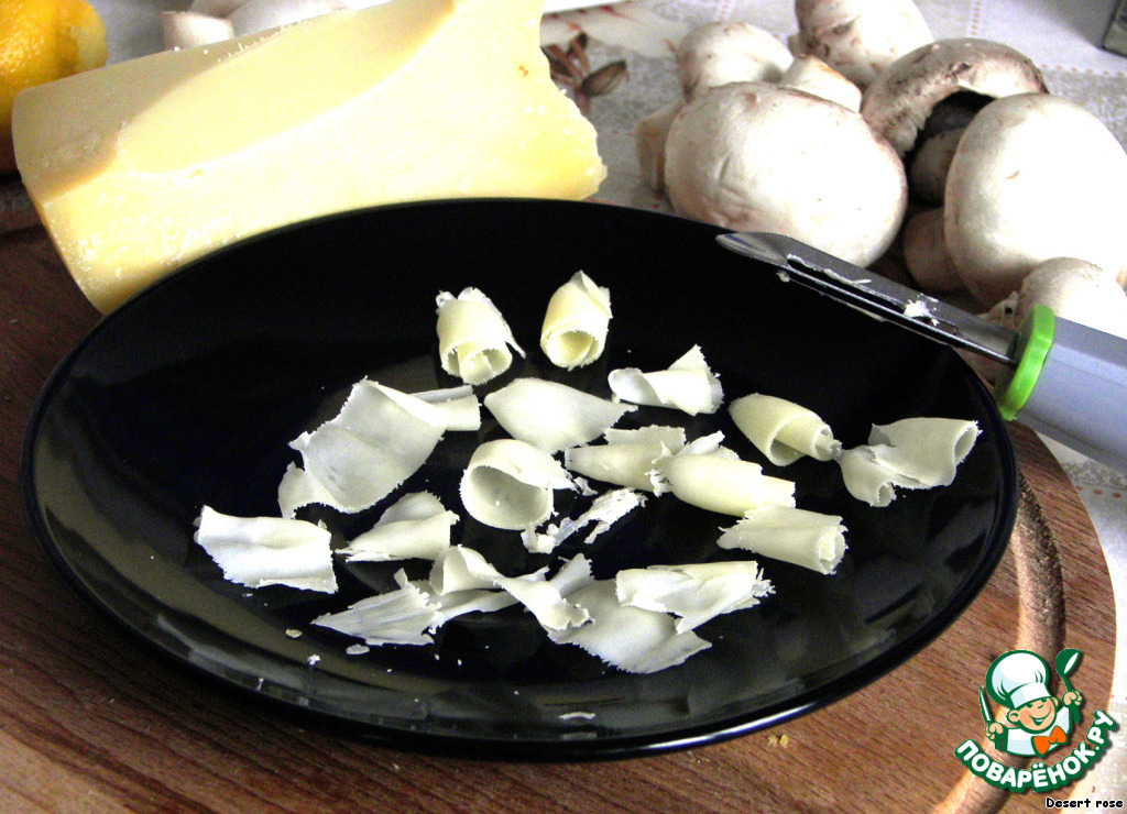 Настругать твердый сыр пластинками. Я делаю это с помощью овощечистки. |