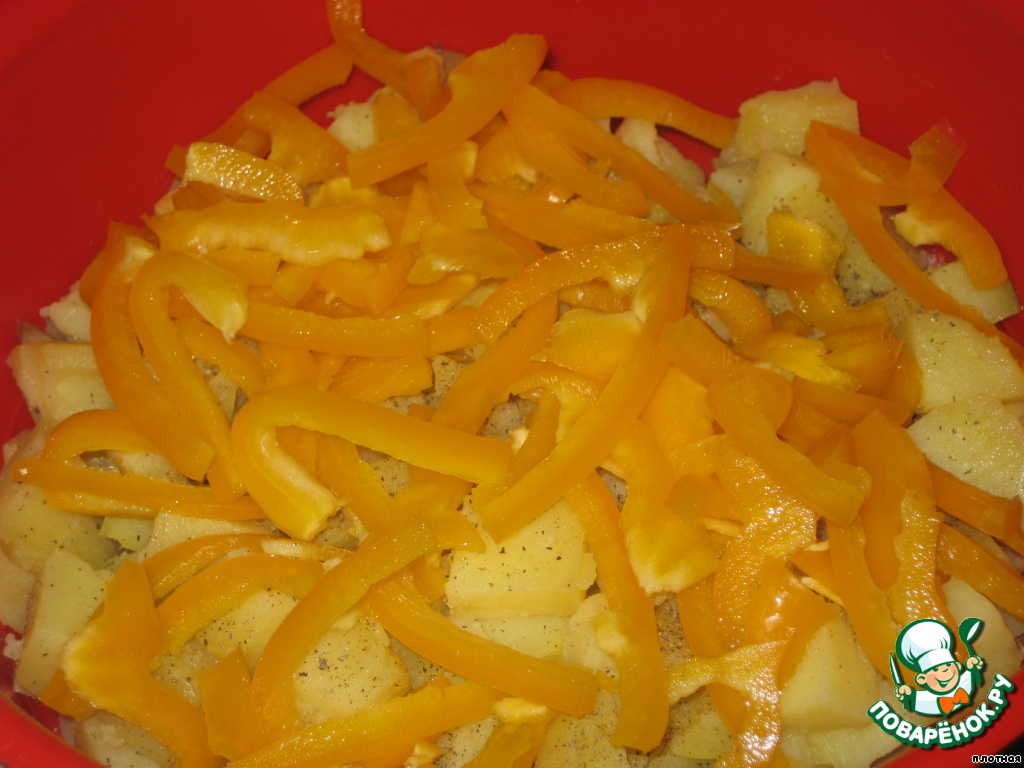Картофель - кубиками, но не мелкими, 1,5х1,5см где-то. Посолить, поперчить.