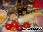 На оливковом масле обжарить мясо, средними по размеру кусками, чтобы не резать потом вместе со специями, солью, чесноком, луком и перцем. Как только мясо обжарится со всех сторон, залить воду на 2/3 кастрюли, закрыть крышкой и варить полчаса. Положить картофель, морковь, кукурузу. Варить еще 15 минут, после чего добавить рис и горошек. Варить до готовности риса (около 20 минут).