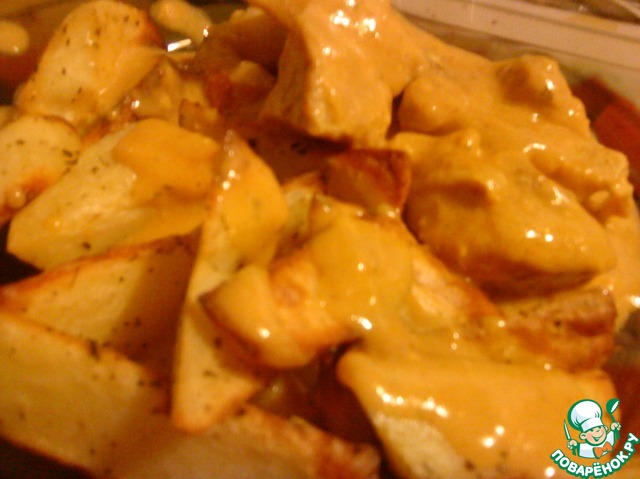 Готовый картофель выкладываем на тарелку и поливаем сливочным соусом.