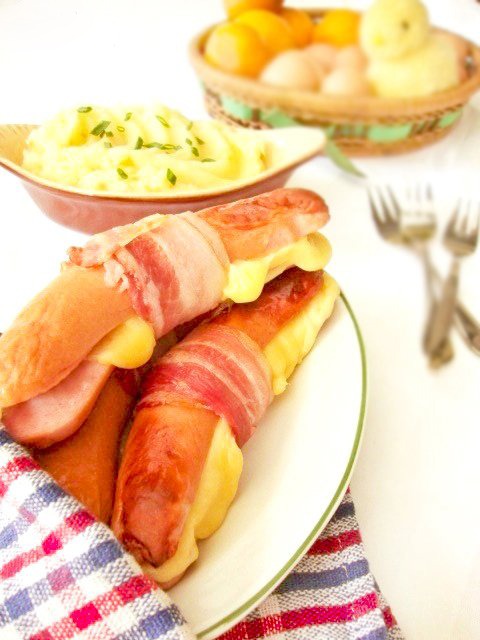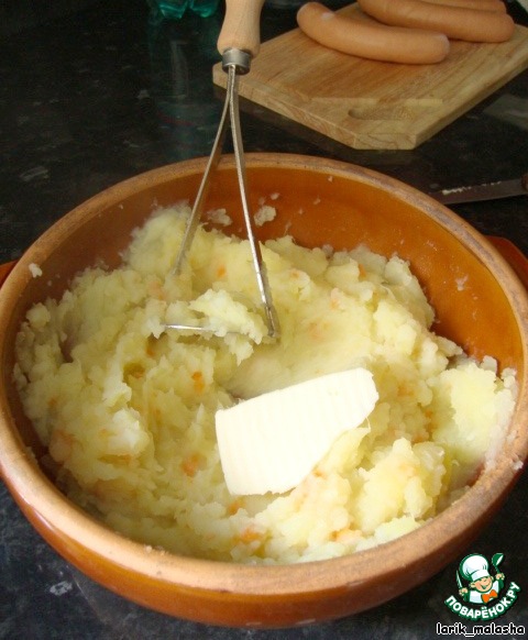 Cervelas a l'alsacienne. Отличное повседневное блюдо, которое понравится своей простотой. Но чтобы сделать его более оригинальным, попробуйте этот гарнир - овощное пюре из картофеля, кабачка и моркови. Очень нежный вкус... Рецепт этого блюда был размещeн на сайте в 2008 году пользователем ЮРИСТИК под названием "Колбаски в беконе" и иллюстрирован мной в рамках акции «Раскраски».