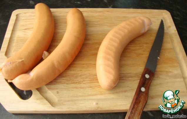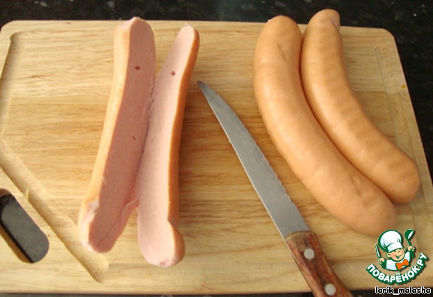 Разрезать каждую колбаску вдоль, но НЕ до конца (как книжка).