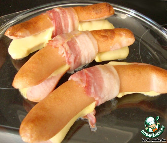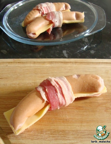 Сыр нарезать тонкими пластинками, вложить в колбаску.