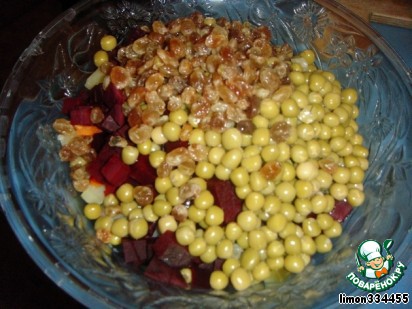 Отварить в подсоленной воде нарезанные кубиками морковь и свеклу. Отдельно отварить в подсоленной воде нарезанный кубиками картофель. Овощные отвары соединить и сохранить, а нарезанные овощи откинуть на дуршлаг, затем смешать с нарезанным соленым огурчиком, нарезанным соломкой репчатым луком, зеленым горошком, изюмом.