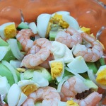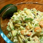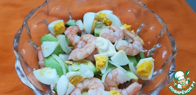 Огурец и лук тоже порезать полукольцами. Яйца отварить и порезать. Все перемешать с майонезом.