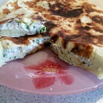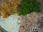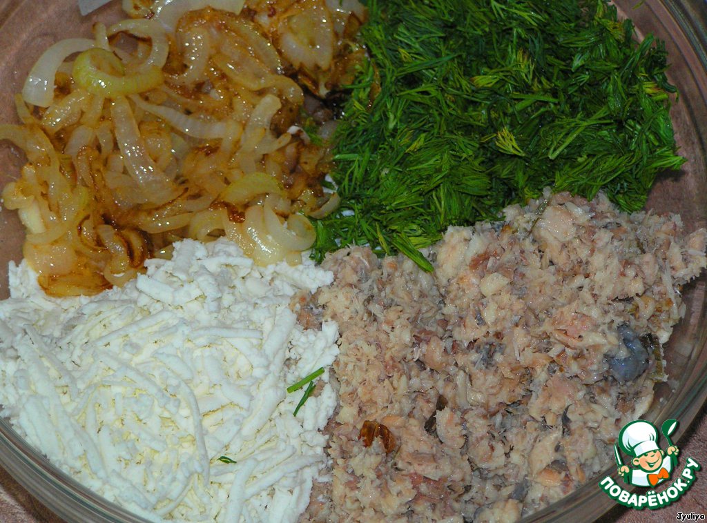 Начинка: Адыгейский сыр натереть на терке, лук нарезать полукольцами, обжарить на растительном масле, зелень нарезать, горбушу размять вилкой, посолить, добавить 1 яйцо, тщательно перемешать. Сварить картофель, сделать из него картофельное пюре (остудить)