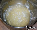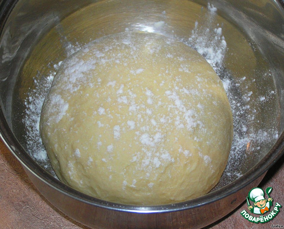 Добавить 1 яйцо, растертое с сахаром, соль, растопленное сливочное масло (остудить), муку. Замесить тесто и поставить его в теплое место на 2 часа.