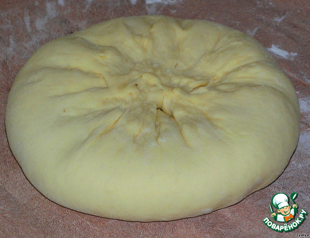 Края лепешки соединить. Пирог аккуратно раскатать, чтоб не было разрывов.