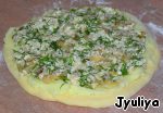 Тесто поделить на 5 частей. Каждую часть раскатать в небольшую лепешку, сверху выложить ровным слоем картофельное пюре, на пюре - рыбную начинку.