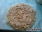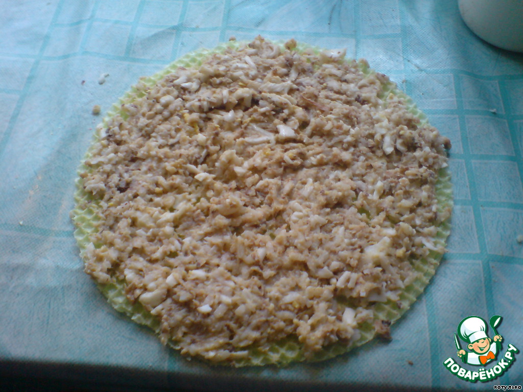 На вафельный корж выкладываем начинку,