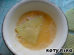 Каждый уголок обмакиваем во взбитых яйцах и обжариваем с двух сторон на сковороде с разогретым растительным маслом.