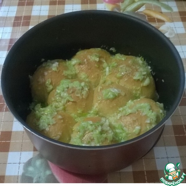 Пока тесто подходит, сделать соус - молодой зеленый чеснок дважды пропустить через мясорубку, добавить соль и постное масло. Все хорошо перемешать.