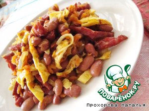 Собираем наш салат! Яичные блины нарезать соломкой. Из фасоли слить жидкость. Смешать все ингредиенты. Посолить, поперчить по вкусу. Дать салату настояться часов 5.