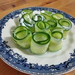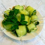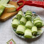 Тоненько нарезать огурец на длинные пластиночки.