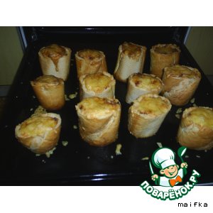 Багет порезать на куски и вытащить мякиш (с одной стороны лучше донышко оставить).