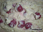 В смесь муки добавить творожную массу и фруктовую, хорошо размешать. Добавить вишню без косточек. У меня была в собственном соку. Еще раз аккуратно размешать.