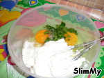 В миске смешать яйца, сметану, молоко, немного зелени,