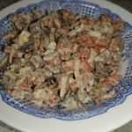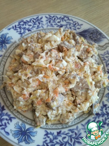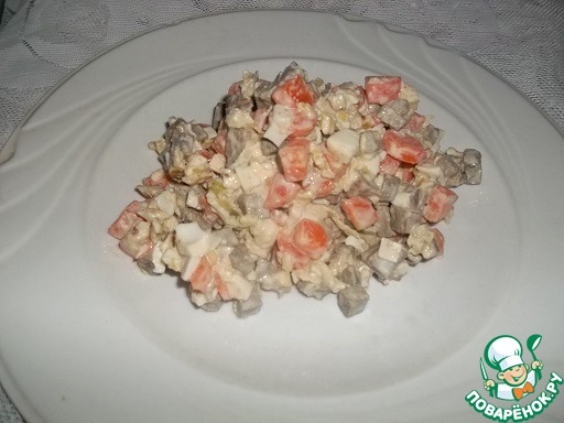 Все соединить. Посолить и поперчить. Майонез перемешать со сметаной 1:1 и выдавить в него чеснок. Заправить салат. Все готово.