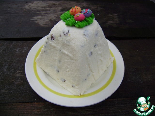 Дуршлаг застелить двухслойной марлей. Края марли должны выступать над краями дуршлага. Уложить смесь, сверху поставить груз. Поместить в холодильник на 10 –12 часов. Перевернуть форму на тарелку, вынуть пасху.