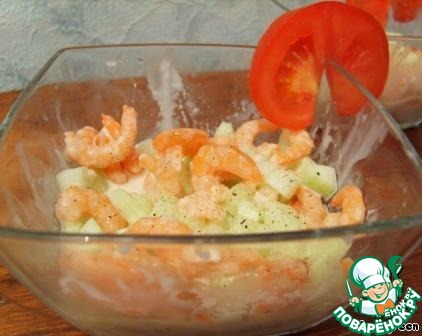 Смешать креветки, соус и огурцы. Поперчить. Украсить помидором.