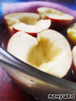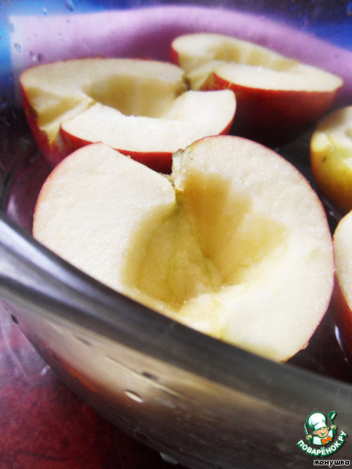По рецепту яблоки необходимо испечь, но, так как у меня духовка была занята, я запекала яблоки в микроволновке.