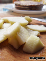 Я для начинки использовала тоже яблоки. Яблоко очистить от кожуры, нарезать и обжарить на сливочном масле. В конце подлить 2 ч.л. коньяка и присыпать сахаром. -
