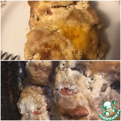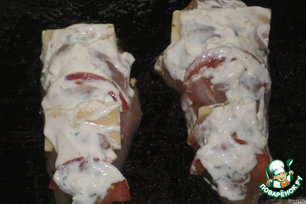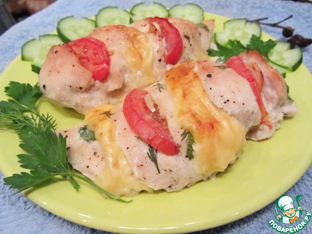 На каждом куске филе сделать три надреза поперек, не до конца, как кармашки. В первый кармашек вложить ломтик сыра, во второй - кусочек помидора, в третий – сыр.
