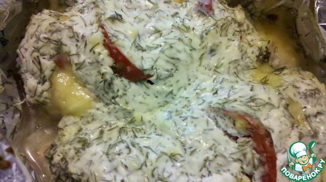 Выложить филе на смазанный маслом противень, смазать сметаной с чесноком. Запекать 30 минут в духовке, нагретой до t=200°С.