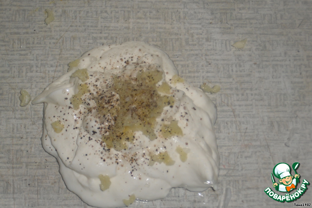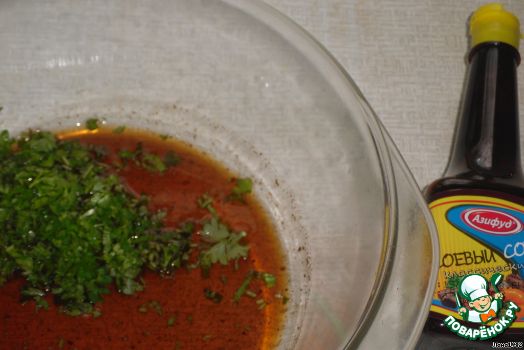 Соевый соус смешать с приправой для мяса, мелко нарезанной петрушкой и чесноком.