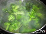 Брокколи можно взять свежую, разделить на соцветия и отварить до готовности. У меня была замороженная, отвариваем её в подсоленной воде около 2 минут. Откидываем на дуршлаг и заливаем ледяной водой или обкладываем льдом, тогда она не будет мягкой (как размазня) и сохранит цвет.