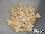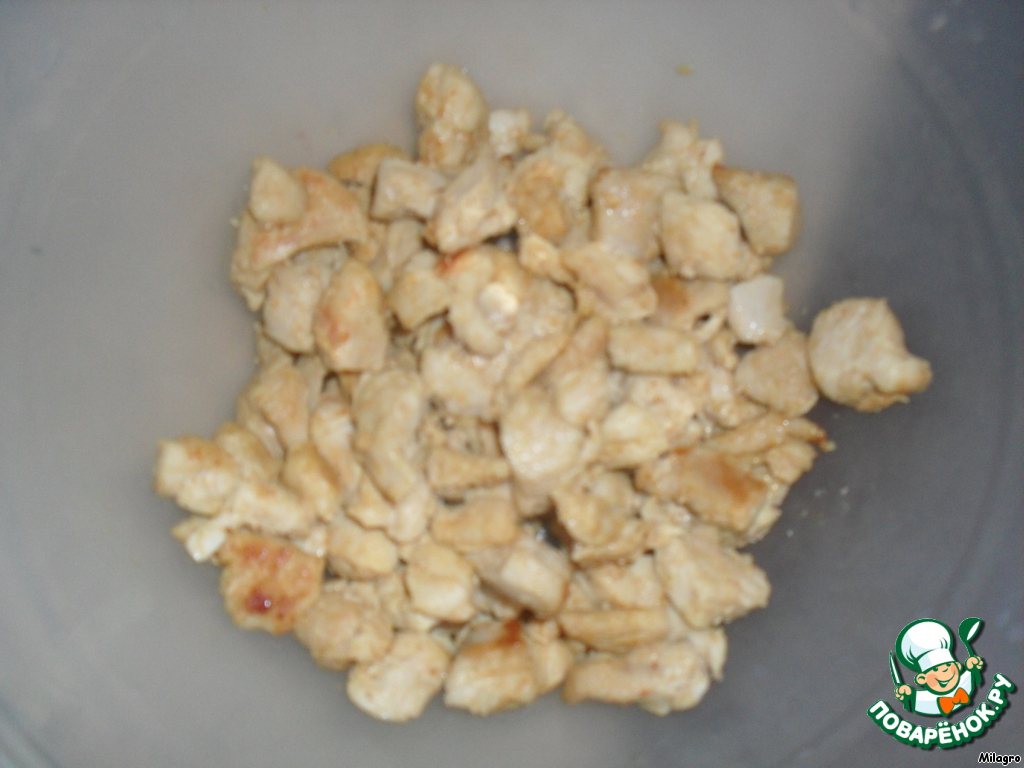 Режем филе на маленькие кусочки, обжариваем в приправах. Я использую смесь приправ для курицы. Нравится получаемый вкус!