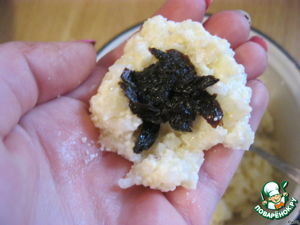 Начинаем собирать наши "рафаэлки": столовой ложкой берем немного "теста", выкладываем чернослив и накрывам еще тестом, |