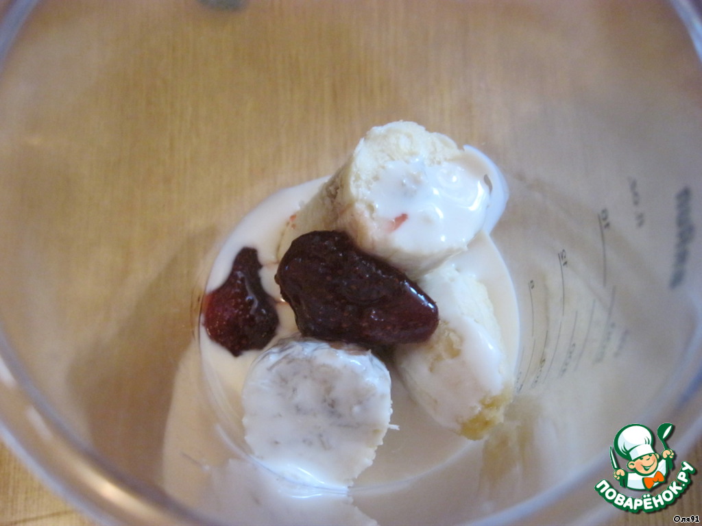 Пока готовятся шарики, сделаем соус: банан, ряженку, варенье взбиваем в блендере, соус готов. |