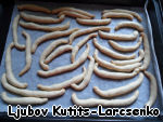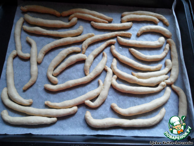 Из теста формуем небольшие палочки, выкладываем их на выстланный смазанным маслом пергаментом противень. Кончики палочек загибаем, придавая изделиям форму рогаликов.