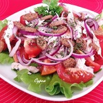 В рецепте лука нет, но при желании в салат можно добавить маринованный репчатый лук. Также получается очень вкусно.