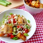 Филе и помидоры соединяем вместе и добавляем сухарики (сухарики добавлять непосредственно перед заправкой и подачей, иначе они станут мягкие).