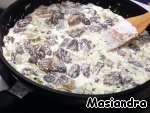 В грибы добавить чайную ложку муки, еще немного поджарить. Добавить сметану, хорошенько перемешать.