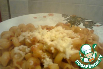 Лучше подавать на разогретой тарелке. Спагетти посыпать сыром. Можно также посыпать заленью или базиликом