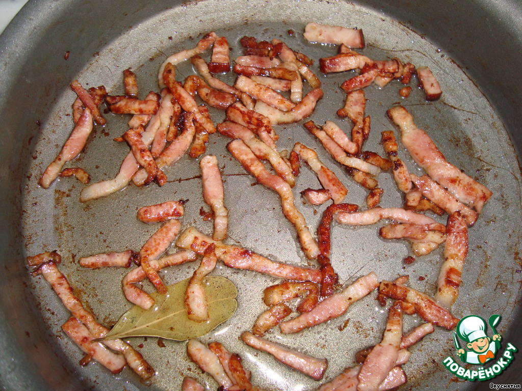 Бекон нарежьте полосками. Растопите в сковороде сливочное масло и обжарьте бекон, добавив лавровый лист (после его нужно вынуть).