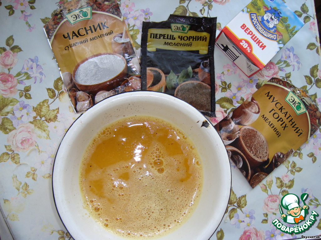 Взбейте в миске яйца, тертый сыр, сливки и специи. Немного подсолите.