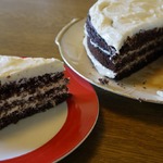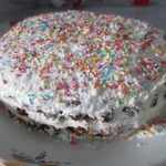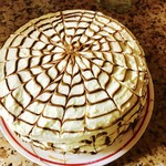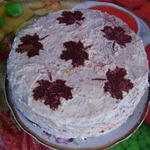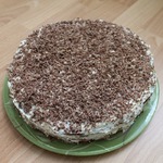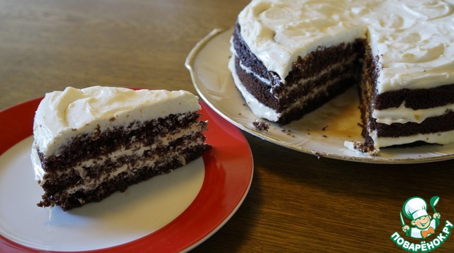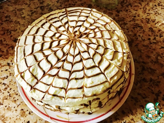 Собрать торт. Каждый слой густо покрывать кремом. Крем очень хорошо держится, можно делать толстый слой. Оставить немножко крема для обмазывания торта снаружи.