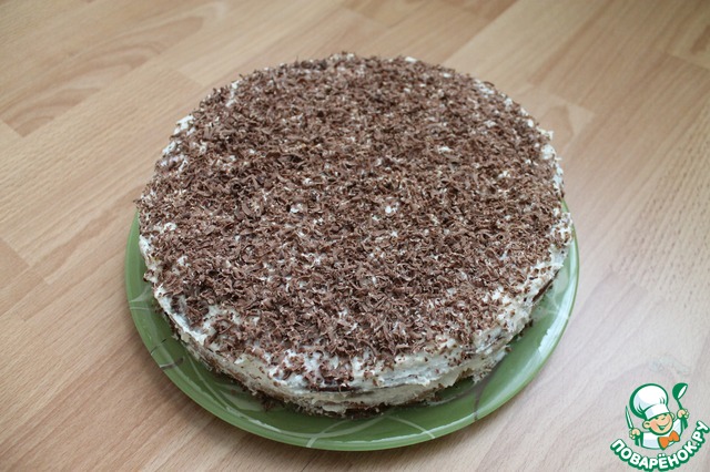 Сварить крепкий натуральный кофе (или приготовить растворимый), добавить сахар и хорошо пропитать все коржи. -