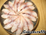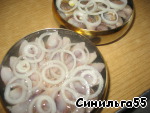 Берем походящую посуду, на дно выкладываем половину лука (красивые колечки оставляем для украшения), икру и кусочки селедки. Я это делаю так, как на фото, по кругу.