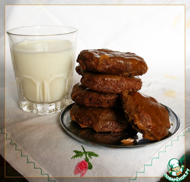 Поставить в разогретую духовку и выпекать при температуре 180 градусов 20-25 минут. Печенье полностью остудить и покрыть кофейной глазурью. Для глазури: растопить 50г сливочного масла, 50мл молока, 1ч.л растворимого кофе и 6-7ст.л сахара, варить, пока масса не станет густеть.