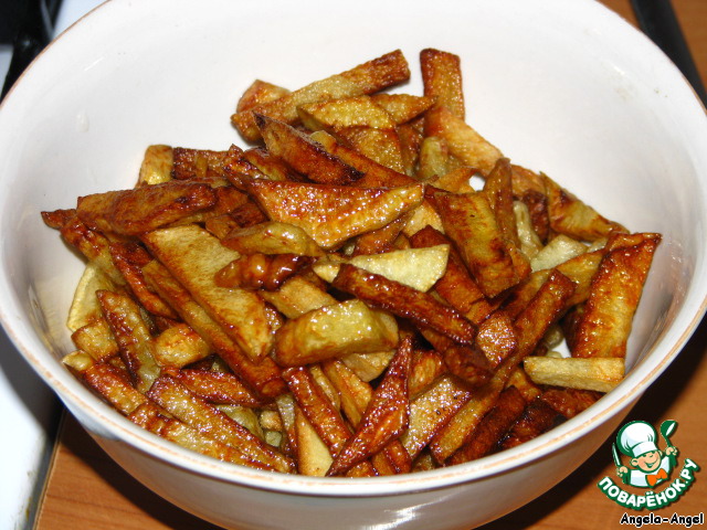 Картошку режем соломкой, подсушиваем, обжариваем в большом количестве масла; готовое фри выкладываем на бумажное полотенце (чтобы впиталось масло).