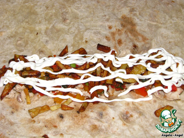 Берем готовый тортильяс (можно купить в магазине), на край выкладываем филе, на него - овощи, сверху - фри, поливаем майонезом, заворачиваем (можно поджарить на вафельнице).